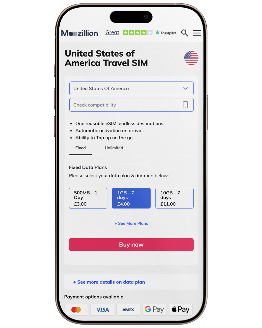 Select the country you want to add data for and pick the fixed or unlimited plan you desire.