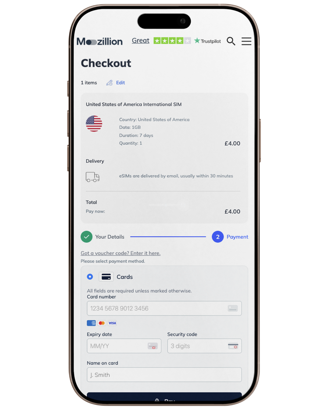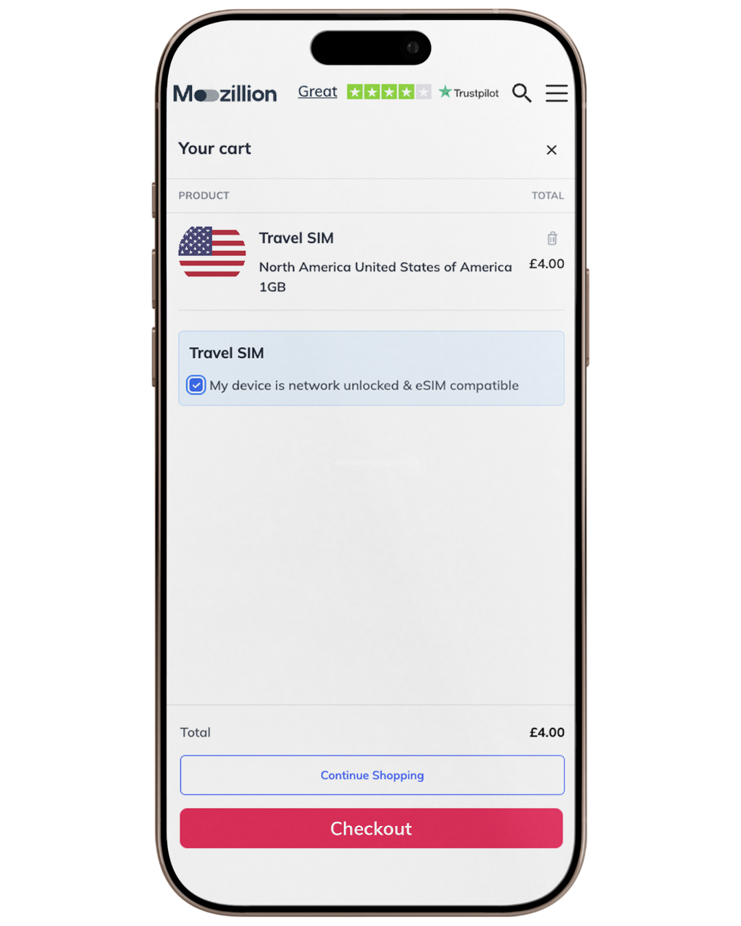 After selecting Buy Now, go to your cart. You must tick the box confirming “My device is network unlocked and eSIM compatible” to be able to proceed to the next step.