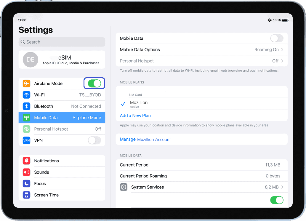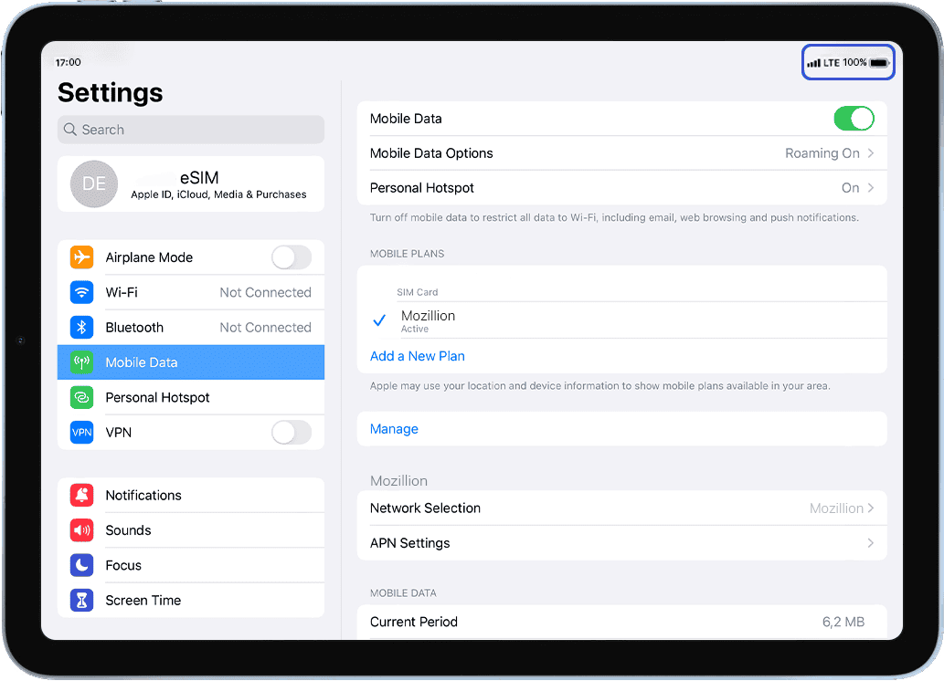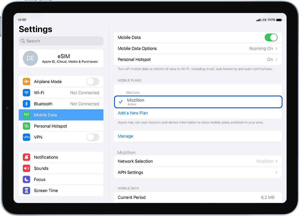Go to: Settings > Mobile Data > under Mobile Plans: installed eSIM profile will appear as Mozillion.