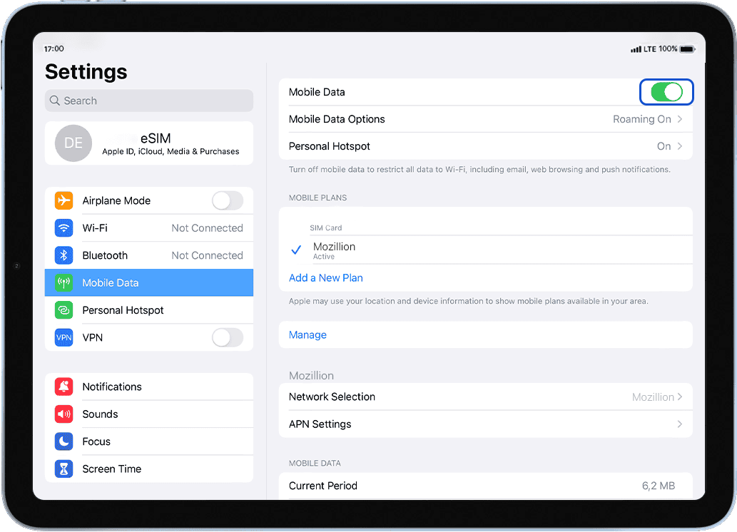 Go to: Settings > Mobile data > under Data plans, make sure that your Mozillion Travel eSIM profile is selected with a