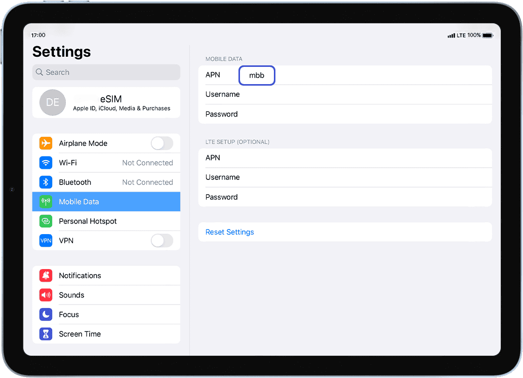 In the APN field, make sure that mbb is specified. If not, type it in the field.